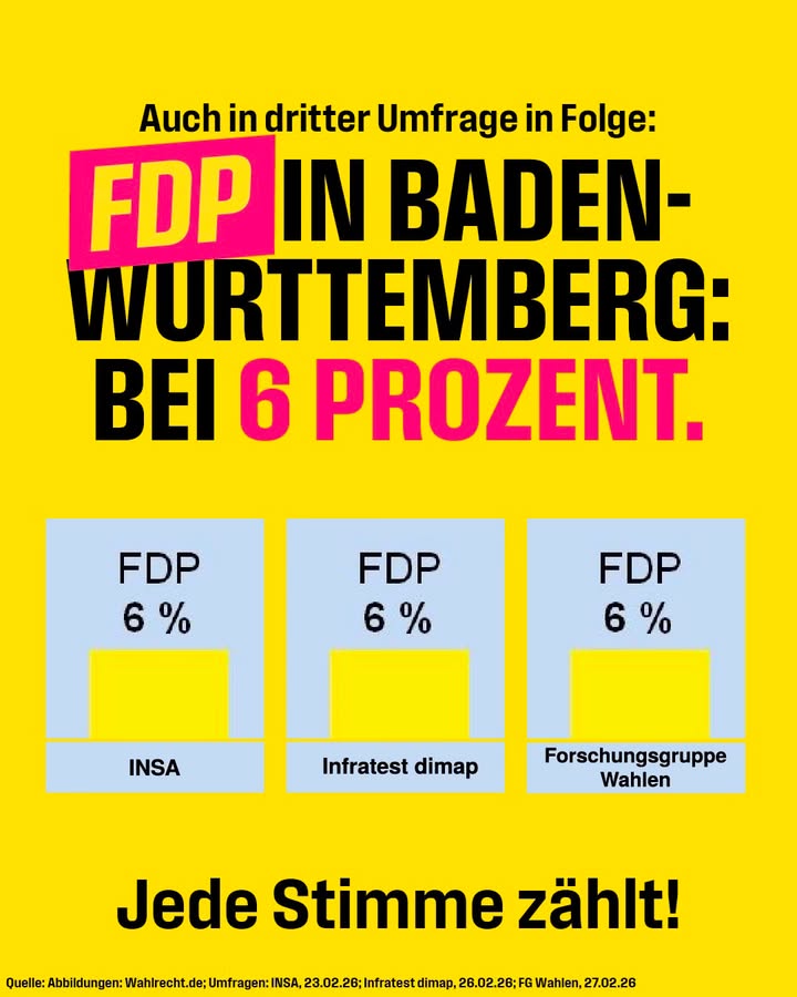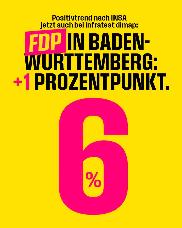 Der Positivtrend setzt sich fort: Nach INSA steigen die Freien Demokraten um Hans-Ulrich Rülke auch bei infratest dimap um einen Prozentpunkt auf 6%. Starke Rückendeckung für den Schlussspurt!